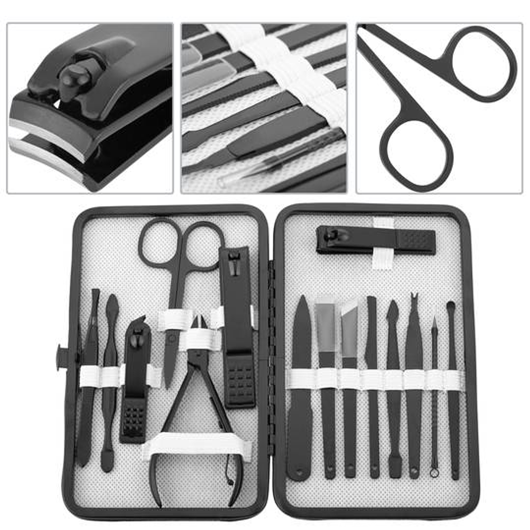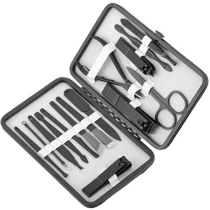 Conjunto de higiene pessoal composto por 15 acessórios em aço inox e muito bem afiados.